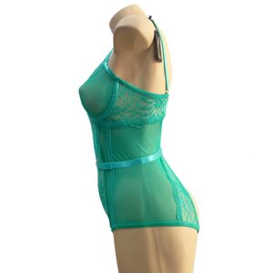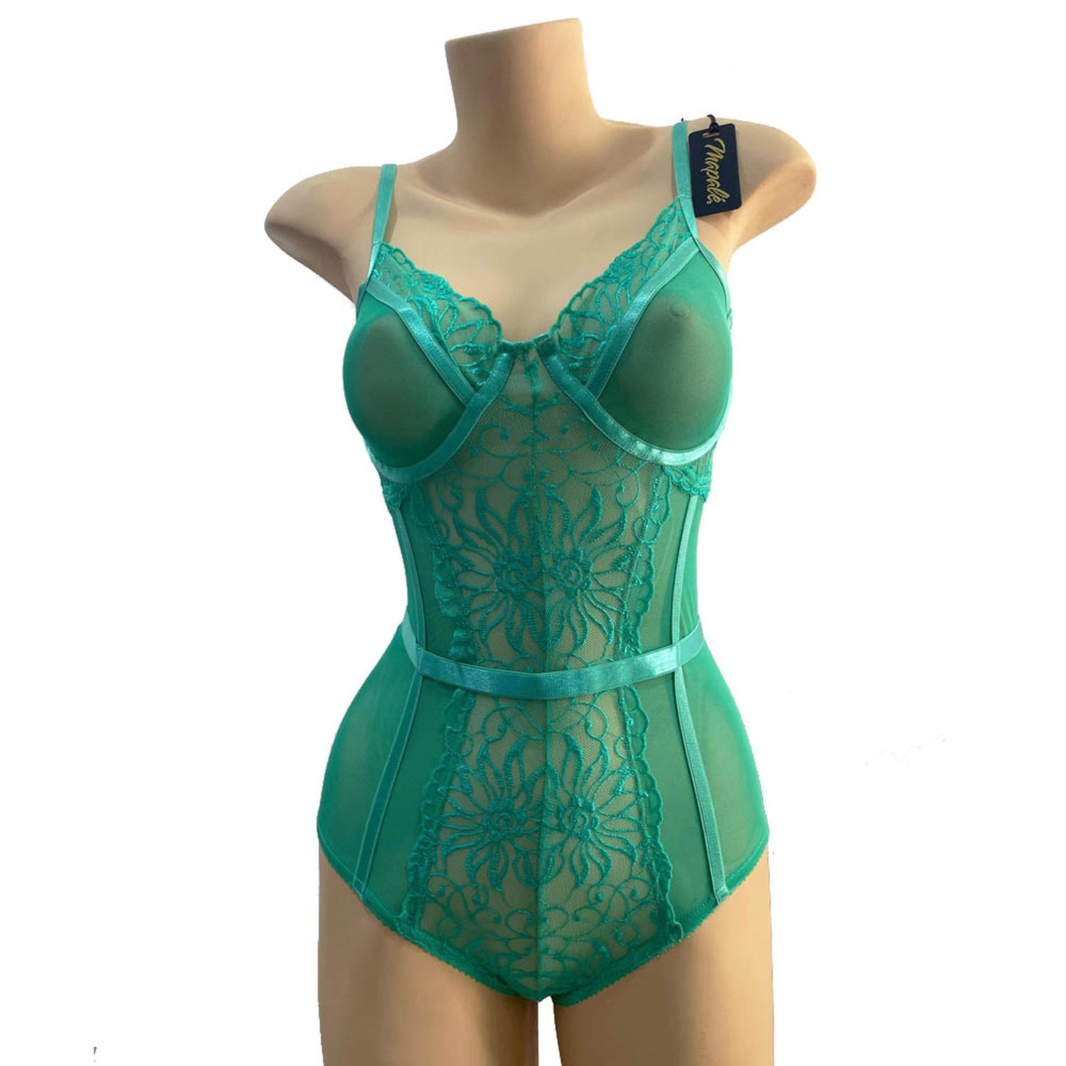 Body de malla y encaje floral con aros para mayor estructura y diseño de espalda abierta.